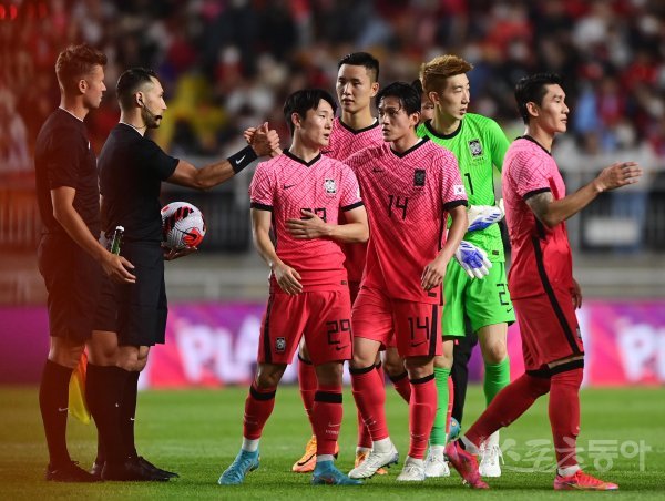 10일 수원월드컵경기장에서 열린 ‘하나은행 초청 축구국가대표팀 친선경기’ 한국과 파라과이의 경기에서 파라과이에 2-2로 무승부를 기록한 한국 선수들이 심판들과 하이파이브를 하고 있다.