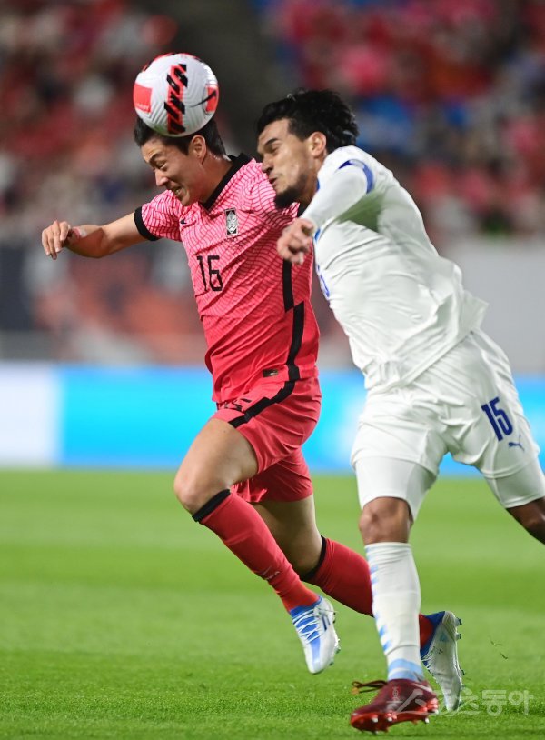 10일 수원월드컵경기장에서 열린 ‘하나은행 초청 축구국가대표팀 친선경기’ 한국과 파라과이의 경기에서 한국 황의조가 헤딩을 하고 있다.