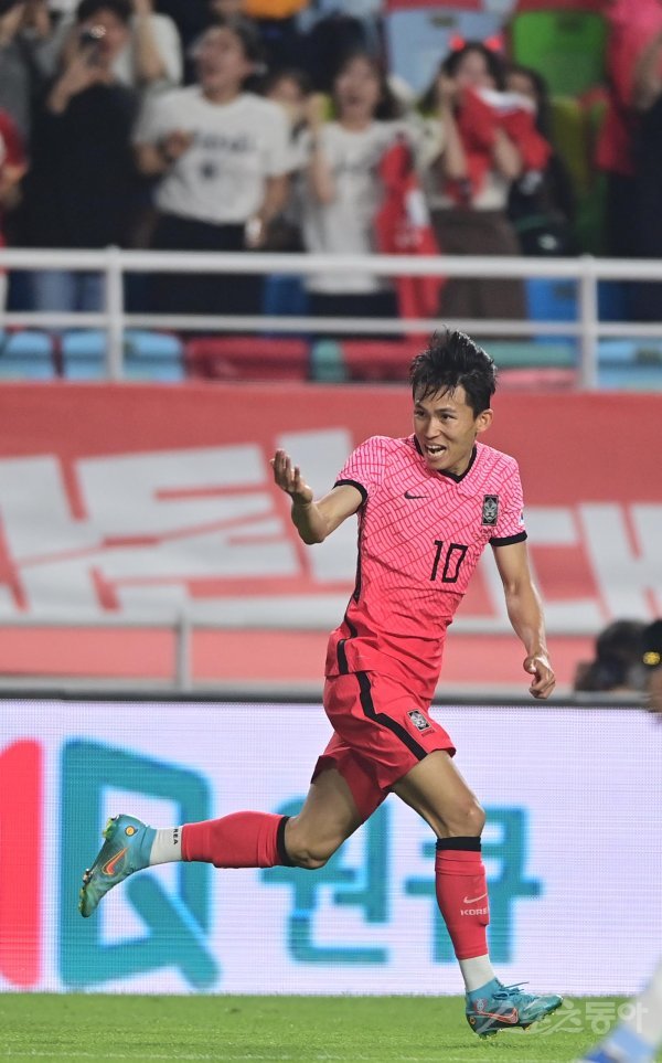 10일 수원월드컵경기장에서 열린 ‘하나은행 초청 축구국가대표팀 친선경기’ 한국과 파라과이의 경기에서 한국 정우영이 동점골을 성공시킨 후 세리머니를 하고 있다.