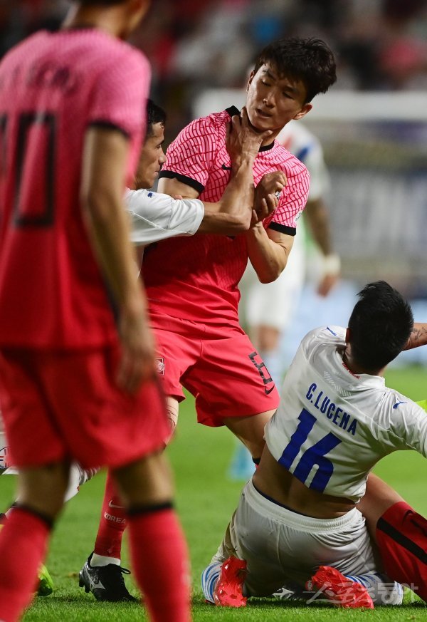 10일 수원월드컵경기장에서 열린 ‘하나은행 초청 축구국가대표팀 친선경기’ 한국과 파라과이의 경기에서 한국 황인범이 파라과이 카살에게 목덜미를 잡히고 있다.
