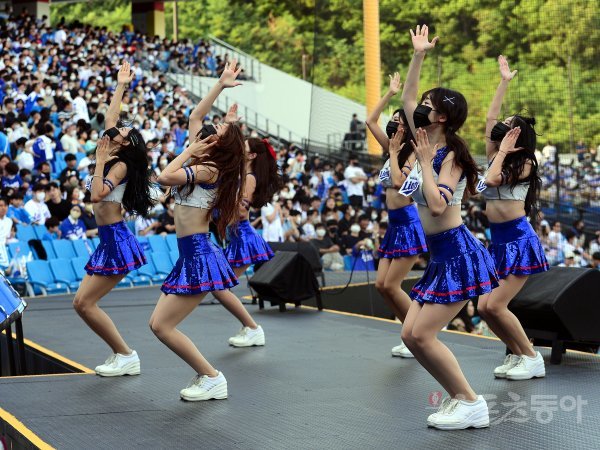 11일 대구 삼성라이온즈파크에서 ‘2022 신한은행 SOL KBO리그’ 삼성 라이온즈와 NC 다이노스의 경기가 열렸다. 삼성 치어리더가 화려한 공연을 선보이고 있다.