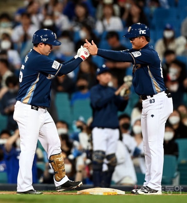 11일 대구 삼성라이온즈파크에서 ‘2022 신한은행 SOL KBO리그’ 삼성 라이온즈와 NC 다이노스의 경기가 열렸다. 연장 11회초 1, 3루에서 NC 권희동이 1타점 적시타를 날린 후 코치의 환영을 받고 있다.