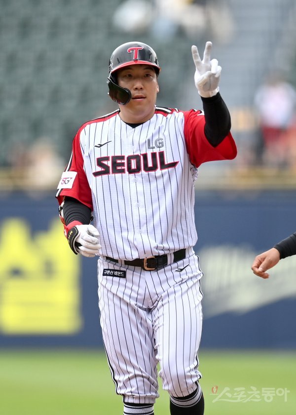 12일 서울 잠실야구장에서 ‘2022 신한은행 MY CAR KBO리그’ 두산 베어스와 LG 트윈스 경기가 열렸다. 1회말 무사 1,2루 LG 김현수가 1타점 적시타를 치고 1루에서 기뻐하고 있다.