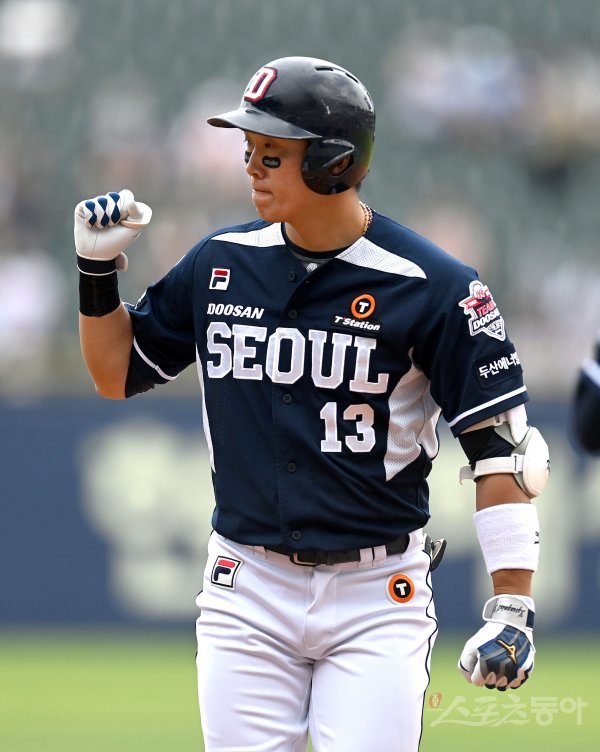 12일 서울 잠실야구장에서 ‘2022 신한은행 MY CAR KBO리그’ 두산 베어스와 LG 트윈스 경기가 열렸다. 1회초 2사 2루 두산 허경민이 1타점 적시타를 치고 1루에서 주먹을 쥐고 있다.