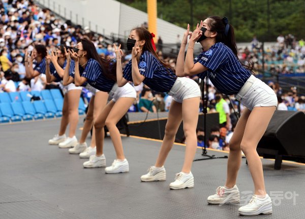 12일 대구 삼성라이온즈파크에서 ‘2022 신한은행 SOL KBO리그’ 삼성 라이온즈와 NC 다이노스의 경기가 열렸다. 삼성 치어리더가 화려한 공연을 펼치고 있다.