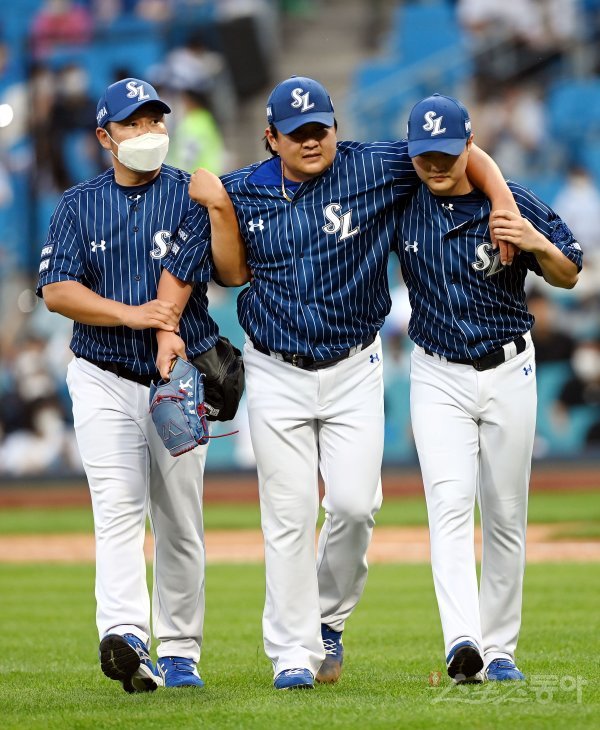 12일 대구 삼성라이온즈파크에서 ‘2022 신한은행 SOL KBO리그’ 삼성 라이온즈와 NC 다이노스의 경기가 열렸다. 7회초 이닝 종료 후 삼성 노성호가 부상으로 트레이너의 부축을 받으며 더그아웃으로 향하고 있다.