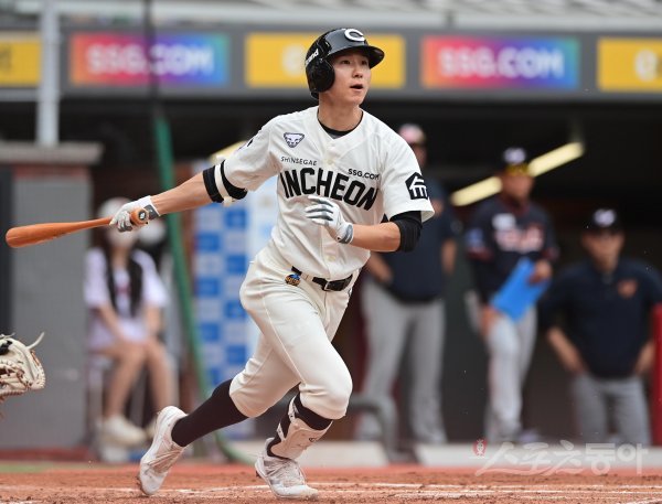 12일 인천 SSG랜더스필드에서 열린 ‘2022 신한은행 SOL KBO리그’ SSG 랜더스와 한화 이글스의 경기에서 1회말 2사 1, 2루 SSG 박성한이 선제 1타점 우전 2루타를 치고 있다.