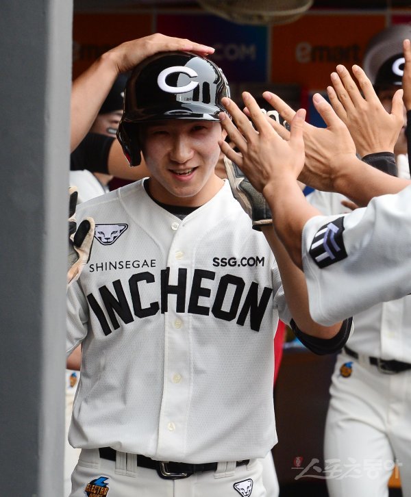 12일 인천 SSG랜더스필드에서 열린 ‘2022 신한은행 SOL KBO리그’ SSG 랜더스와 한화 이글스의 경기에서 1회초 2사 2, 3루 SSG의 우전 적시타 때 득점에 성공한 2루주자 박성한이 더그아웃에서 동료들의 축하를 받고 있다.