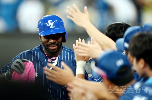 12일 대구 삼성라이온즈파크에서 ‘2022 신한은행 SOL KBO리그’ 삼성 라이온즈와 NC 다이노스의 경기가 열렸다. 8회말 무사 2, 3루에서 삼성 피렐라가 3점 홈런을 쏘아 올린 후 동료들의 환영을 받고 있다.