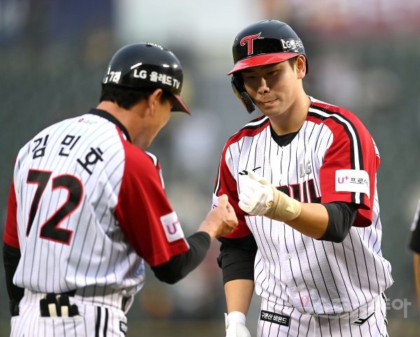 12일 서울 잠실야구장에서 ‘2022 신한은행 MY CAR KBO리그’ 두산 베어스와 LG 트윈스 경기가 열렸다. 5회말 1사 1,2루 LG 홍창기가 역전 2타점 중전 3루타를 치고 3루에서 주루코치와 주먹을 맞대고 있다.