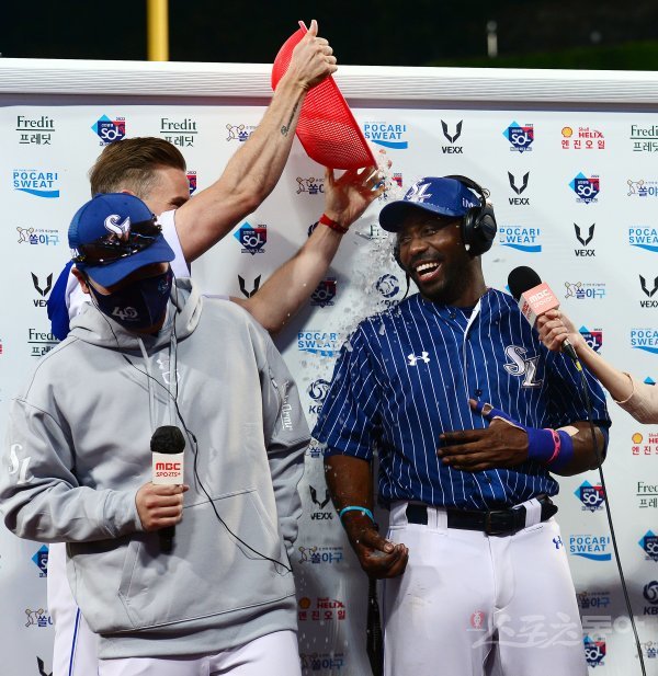 12일 대구 삼성라이온즈파크에서 ‘2022 신한은행 SOL KBO리그’ 삼성 라이온즈와 NC 다이노스의 경기가 열렸다. 삼성이 NC를 상대로 4-2로 승리한 뒤 뷰캐넌이 인터뷰하는 피렐라에게 얼음을 쏟아붓고 있다.