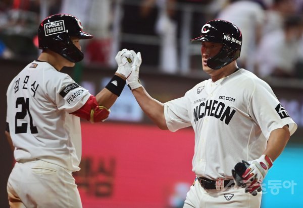 12일 인천 SSG랜더스필드에서 열린 ‘2022 신한은행 SOL KBO리그’ SSG 랜더스와 한화 이글스의 경기에서 7회말 무사 SSG 하재훈이 좌월 솔로 홈런을 쳐낸 뒤 동료와 기쁨을 나누고 있다.
