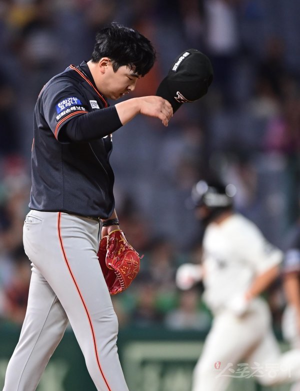 12일 인천 SSG랜더스필드에서 열린 ‘2022 신한은행 SOL KBO리그’ SSG 랜더스와 한화 이글스의 경기에서 7회말 무사 SSG에 솔로 홈런을 허용한 한화 강재민이 아쉬워하고 있다.