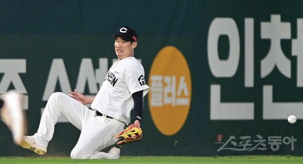 12일 인천 SSG랜더스필드에서 열린 ‘2022 신한은행 SOL KBO리그’ SSG 랜더스와 한화 이글스의 경기에서 7회초 무사 2루 한화의 좌전 2루타 타구를 SSG 오태곤이 미끄러지며 놓치고 있다.