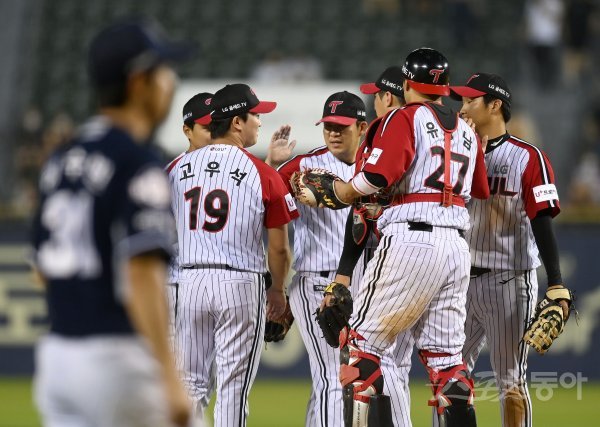12일 서울 잠실야구장에서 ‘2022 신한은행 MY CAR KBO리그’ 두산 베어스와 LG 트윈스 경기가 열렸다. 9-6 승리를 거두며 위닝시리즈를 기록한 LG 선수들이 하이파이브 하고 있다.