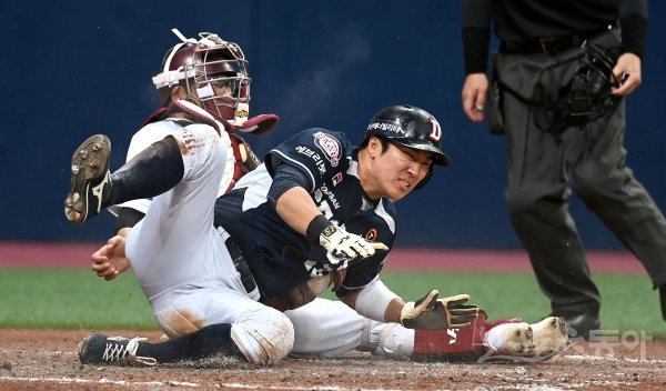 14일 서울 고척스카이돔에서 ‘2022 신한은행 MY CAR KBO리그’ 두산 베어스와 키움 히어로즈 경기가 열렸다. 6회초 1사 1,3루 두산 외야 뜬공 때 두산 3루주자 허경민이 태그업 시도해 홈으로 달렸으나 키움 이지영에게 태그 아웃되고 있다.