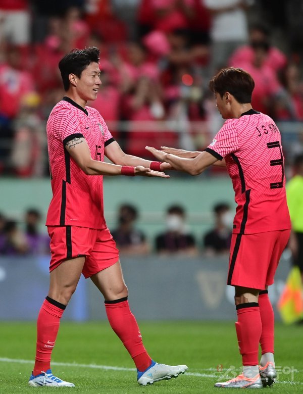 14일 서울월드컵경기장에서 열린 ‘하나은행 초청 축구국가대표팀 친선경기’ 한국과 이집트의 경기에서 한국 황의조가 선제골을 성공시킨 후 동료와 기쁨을 나누고 있다.