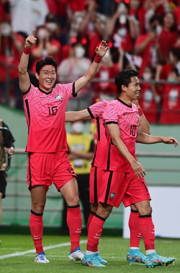 14일 서울월드컵경기장에서 열린 ‘하나은행 초청 축구국가대표팀 친선경기’ 한국과 이집트의 경기에서 한국 황의조가 선제골을 성공시킨 후 세리머니를 하고 있다.