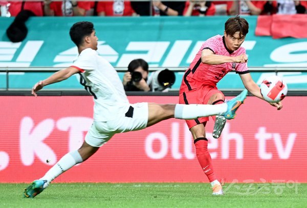 14일 서울 마포구 서울월드컵경기장에서 열린 한국과 이집트의 친선경기에서 한국 김진수가 패스를 연결하고 있다.