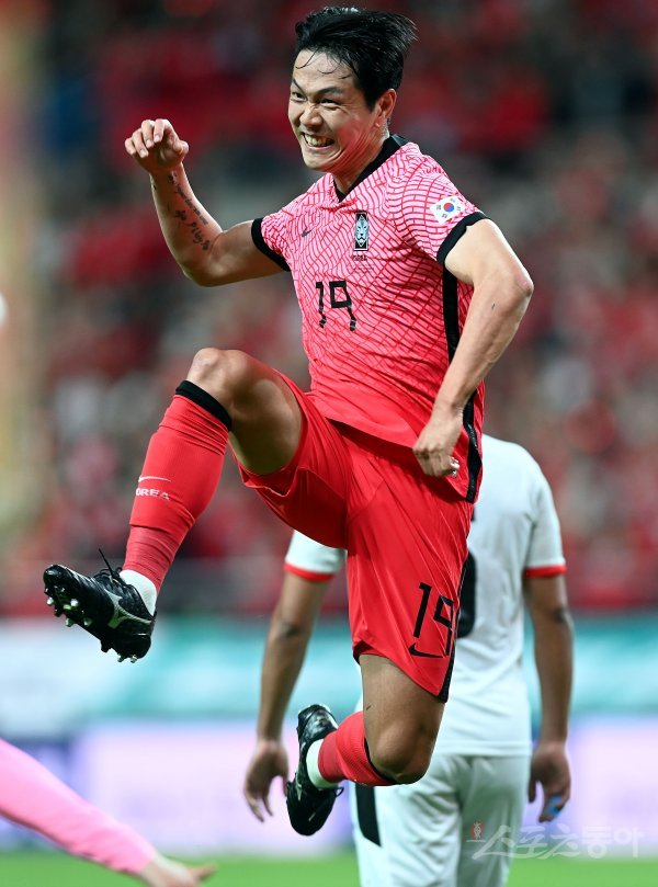 14일 서울 마포구 서울월드컵경기장에서 열린 한국과 이집트의 친선경기에서 한국 김영권이 골을 넣은 후 환호하고 있다.