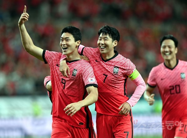 14일 서울 마포구 서울월드컵경기장에서 한국과 이집트의 친선경기에서 한국 조규성이 골을 넣은 후 손흥민과 기쁨을 나누고 있다.