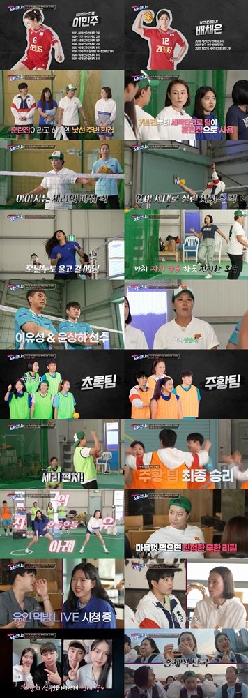 ‘초록팀’ 한유미는 네트에 밀착, 익룡 소리와 막강한 블로킹으로 초반 기선제압에 나섰다. 그러나 4:0까지 앞서나갔던 ‘초록팀’은 배채은의 실수와 박세리의 공격 실패 등으로 ‘주황팀’에 점수를 내줬고, ‘주황팀’ 김성연은 몸을 날린 ‘시저스킥’ 성공으로 4:4 동점을 만들어냈다. ‘주황팀’은 ‘초록팀’의 멘탈을 흔들며 무섭게 치고 올라갔고, 6:8까지 점수차를 넓혔던 ‘주황팀’은 정유인의 재빠른 헤딩 성공으로 6:9까지 앞장섰다. 계속해서 우승까지 1점을 앞둔 상황에서 ‘주황팀’을 꺾으려던 ‘초록팀’ 박세리는 급한 마음에 손터치 실수를 저질러 ‘주황팀’이 최종승리를 차지했다. 경기를 마치고 세팍타크로 선수 맞춤 3종 세트를 받은 이민주와 배채은은 보답의 의미로 2주간 연습한 싸이의 ‘That That’ 무대를 선사해 뜨거운 환호를 받았다.