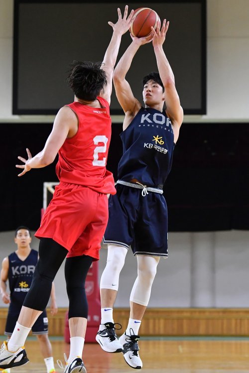 남자농구국가대표팀 여준석(오른쪽)이 고려대와 연습경기 도중 슛을 시도하고 있다. 사진제공 | 점프볼