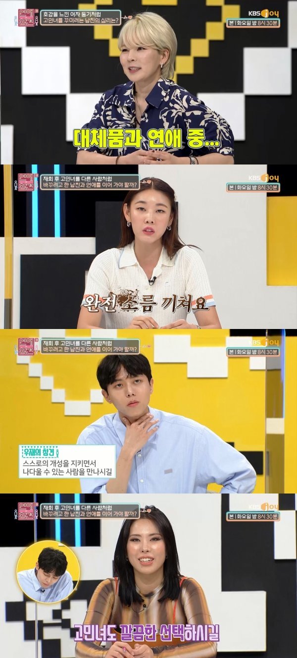 주우재는 "호감 가는 직장 동료에게 접근해 봤는데 잘 안 됐던 거다. 왜 인형놀이에 놀아나나. 본인이 본인일 수 있는 사람을 만나라"고 조언했고, 서장훈은 "남자친구는 나중에 또 본인 취향에 맞는 사람이 눈에 들어오면 뒤도 안 돌아보고 그 사람에게 갈 거다"라고 추측했다.