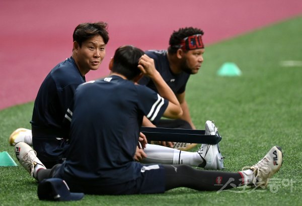 15일 서울 고척스카이돔에서 ‘2022 신한은행 MY CAR KBO리그’ 두산 베어스와 키움 히어로즈 경기가 열린다. 경기 전 두산 박세혁이 이야기를 하고 있다.