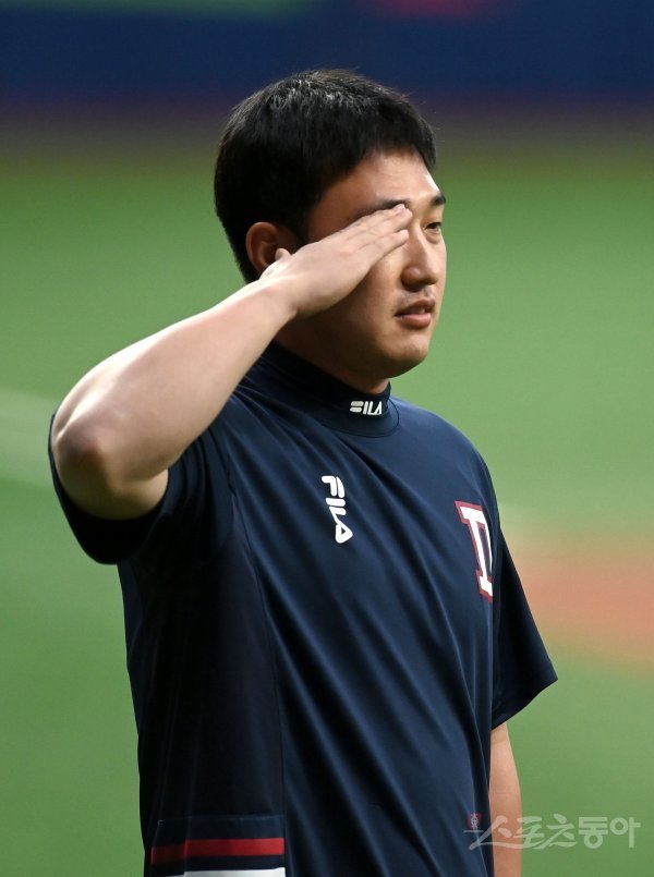 15일 서울 고척스카이돔에서 ‘2022 신한은행 MY CAR KBO리그’ 두산 베어스와 키움 히어로즈 경기가 열린다. 경기 전 두산 김인태가 거수경례로 인사하고 있다.