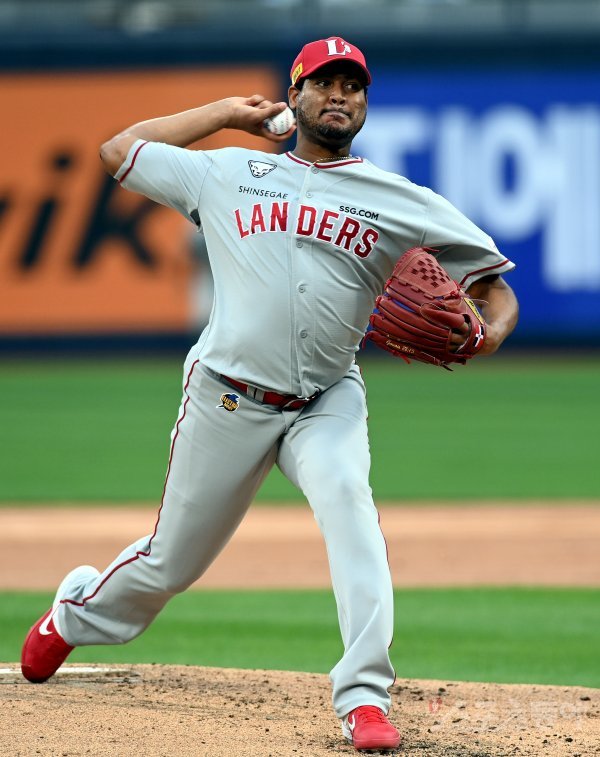 15일 경기도 수원 kt위즈파크에서 ‘2022 신한은행 SOL KBO리그’ kt 위즈와 SSG 랜더스의 경기가 열렸다. SSG 선발투수 노바가 힘차게 볼을 던지고 있다.