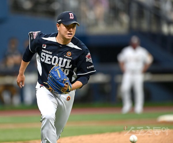 15일 서울 고척스카이돔에서 ‘2022 신한은행 MY CAR KBO리그’ 두산 베어스와 키움 히어로즈 경기가 열렸다. 선발 투수로 등판한 두산 이영하가 3회말 2사 키움 1루수 앞 땅볼 때 베이스커버에 들어가고 있다.