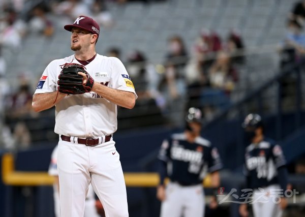 15일 서울 고척스카이돔에서 ‘2022 신한은행 MY CAR KBO리그’ 두산 베어스와 키움 히어로즈 경기가 열렸다. 선발 투수로 등판한 키움 애플러가 1회초 1사 만루 상화에서 외야를 바라보고 있다.