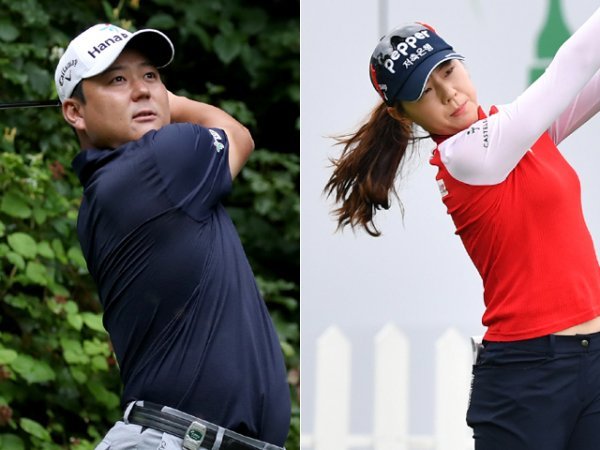 하나은행 인비테이셔널 1라운드 11번 홀에서 티샷을 하고 있는 함정우(왼쪽 )와 D B그룹 제36회 한국여자오픈 1라운드 10번 홀에서 티샷을 하고 있는 강예린. 사진제공 | KPGA, KGA