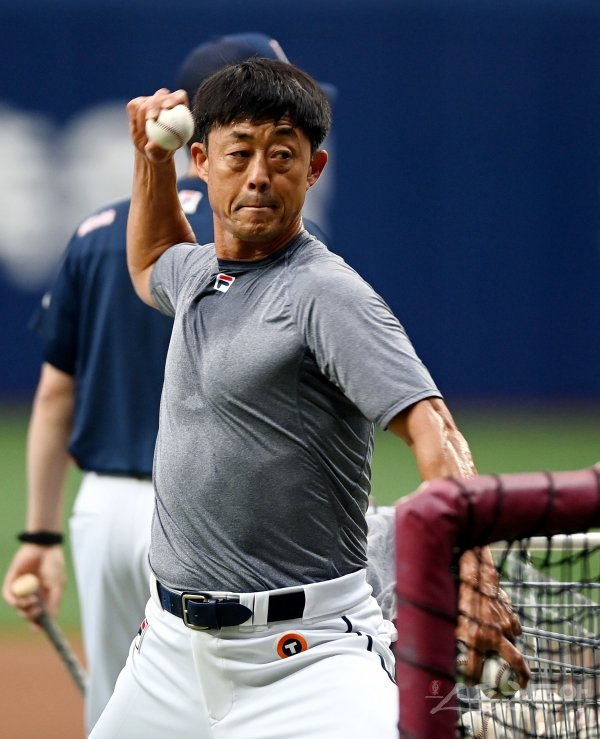 16일 서울 고척스카이돔에서 ‘2022 신한은행 SOL KBO리그’ 키움 히어로즈와 두산 베어스의 경기가 열린다. 경기 전 두산 조경택 코치가 배팅볼을 던지고 있다.