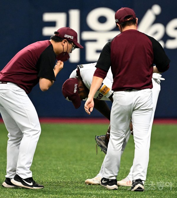 16일 서울 고척스카이돔에서 ‘2022 신한은행 SOL KBO리그’ 키움 히어로즈와 두산 베어스의 경기가 열렸다. 2회초 무사 2루에서 키움 푸이그가 수비를 펼치다 부상으로 고통을 호소하고 있다.