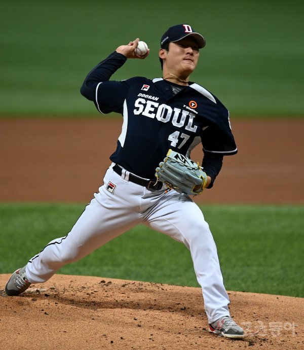 16일 서울 고척스카이돔에서 ‘2022 신한은행 SOL KBO리그’ 키움 히어로즈와 두산 베어스의 경기가 열렸다. 두산 선발투수 곽빈이 힘차게 볼을 던지고 있다.