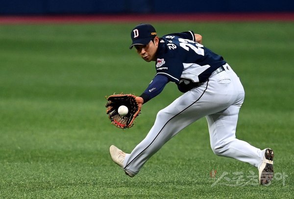 16일 서울 고척스카이돔에서 ‘2022 신한은행 SOL KBO리그’ 키움 히어로즈와 두산 베어스의 경기가 열렸다. 1회말 무사에서 두산 강승호가 내야땅볼 타구를 수비하고 있다.