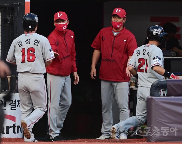 16일 경기도 수원KT위즈파크에서 열린 ‘2022 신한은행 SOL KBO리그’ KT 위즈와 SSG 랜더스의 경기에서 2회초 2사 2, 3루 SSG 김원형 감독이 중전 적시타 때 득점에 성공한 2루주자 김성현을 축하하고 있다.