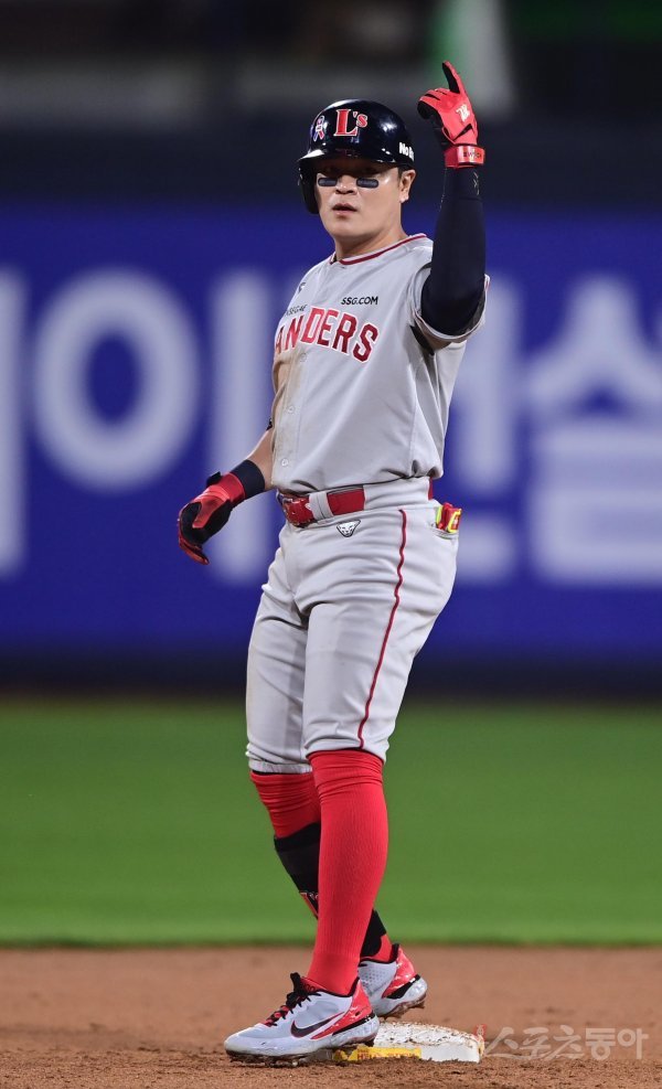 16일 경기도 수원KT위즈파크에서 열린 ‘2022 신한은행 SOL KBO리그’ KT 위즈와 SSG 랜더스의 경기에서 9회초 무사 2루 SSG 추신수가 1타점 중전 2루타를 쳐낸 뒤 세리머니를 하고 있다.