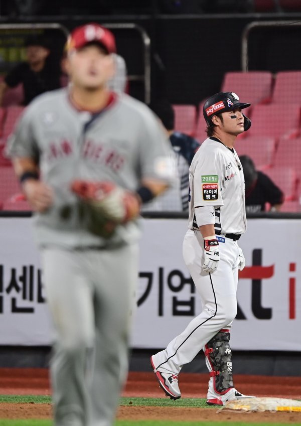 16일 경기도 수원KT위즈파크에서 열린 ‘2022 신한은행 SOL KBO리그’ KT 위즈와 SSG 랜더스의 경기에서 6회말 1사 1루 KT 박병호가 병살타를 치고 아쉬워하고 있다.