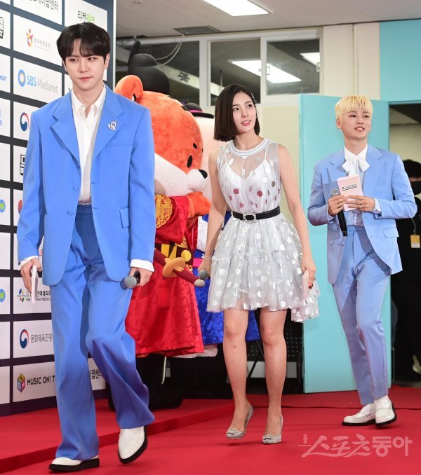 앨리스 소희, 위아이 김동한, 강석화가 18일 서울 잠실올림픽주경기장에서 열린 ‘28회 드림콘서트’ 포토월에 입장하고 있다.
