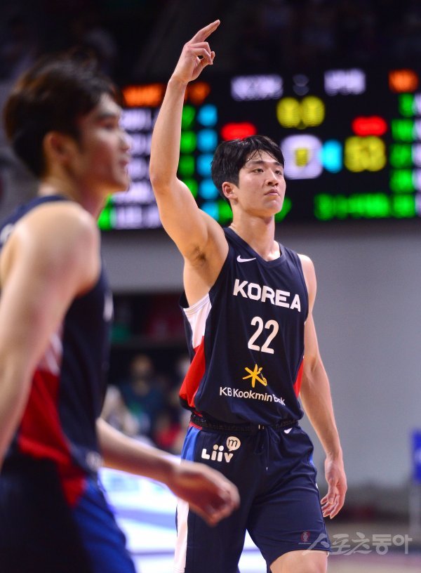 18일 안양실내체육관에서 열린 남자농구 국가대표팀과 필리핀 남자농구 국가대표팀 평가전에서 한국 여준석이 득점에 성공한 후 기뻐하고 있다.