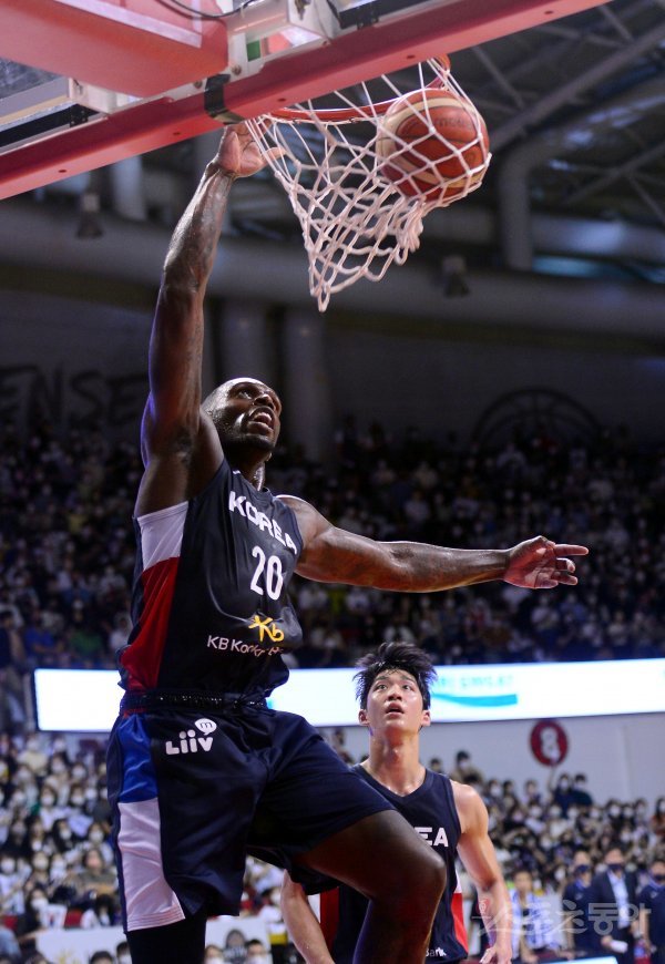 18일 안양실내체육관에서 열린 남자농구 국가대표팀과 필리핀 남자농구 국가대표팀 평가전에서 한국 라건아가 덩크슛을 성공시키고 있다.