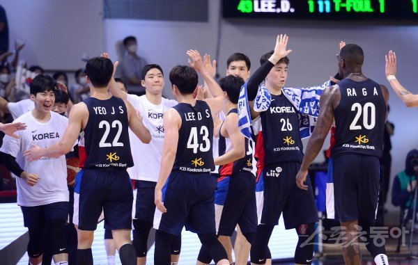 18일 안양실내체육관에서 열린 남자농구 국가대표팀과 필리핀 남자농구 국가대표팀 평가전에서 3쿼터 동점을 기록한 한국 선수들이 기뻐하고 있다.