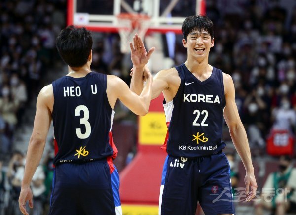18일 안양실내체육관에서 열린 남자농구 국가대표팀과 필리핀 남자농구 국가대표팀 평가전에서 한국 여준석이 득점에 성공한 후 기뻐하고 있다.