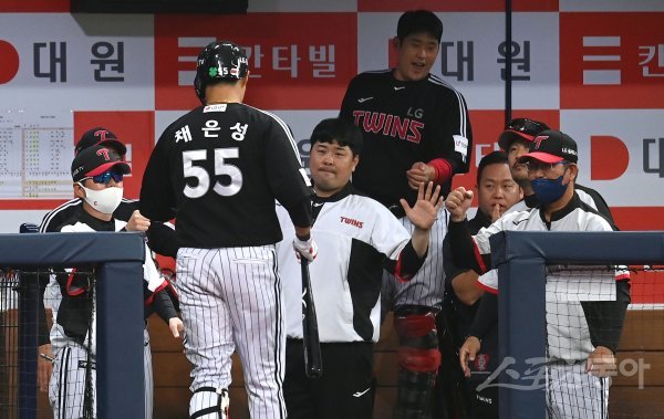 19일 서울 고척스카이돔에서 ‘2022 신한은행 MY CAR KBO리그’ LG 트윈스와 키움 히어로즈 경기가 열렸다. 7회초 무사 LG 채은성이 동점 좌중월 솔로 홈런을 날리고 그라운드를 돌아 홈인해 류지현 감독의 축하를 받고 있다.