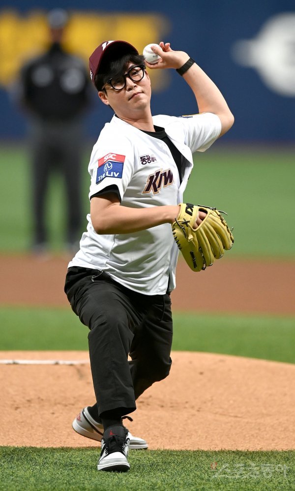 19일 서울 고척스카이돔에서 ‘2022 신한은행 MY CAR KBO리그’ LG 트윈스와 키움 히어로즈 경기가 열렸다. 경기 전 개그맨 신흥재가 시구를 하고 있다.