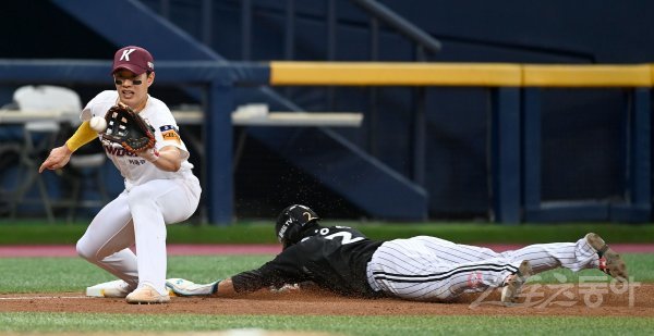 19일 서울 고척스카이돔에서 ‘2022 신한은행 MY CAR KBO리그’ LG 트윈스와 키움 히어로즈 경기가 열렸다. 연장 10회초 무사 1,2루 LG 내야 땅볼 때 2루주자 이상호가 3루에서 세이프 되고 있다.