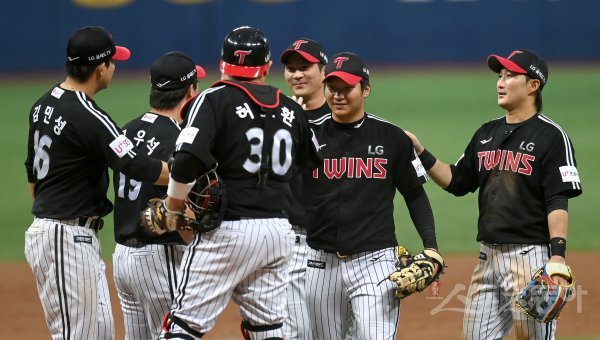 19일 서울 고척스카이돔에서 ‘2022 신한은행 MY CAR KBO리그’ LG 트윈스와 키움 히어로즈 경기가 열렸다. 4-2 역전승을 거둔 LG 선수들이 하이파이브 하고 있다.